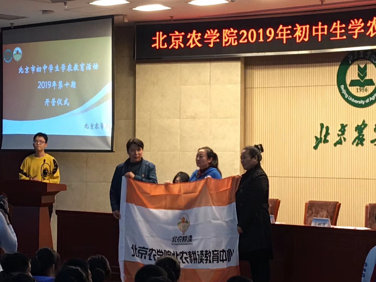 随后由王树涛老师为实验校授旗,为学农班授牌。