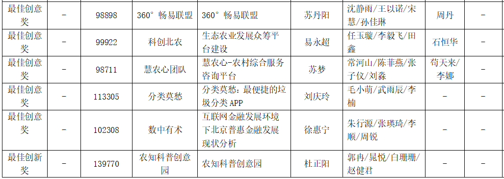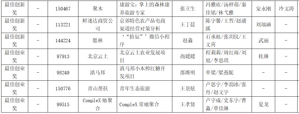 本次大赛经过初步审核、商业计划书专家评审、路演答辩等环节,所有项目充分、全面的进行了淬炼和提升。大赛本着公正、公平、公开的原则评选出一等奖一名,二等奖两名,三等奖四名,最佳创意奖五名,最佳创新奖四名,最佳创业奖四名。现将获奖结果公布如下: