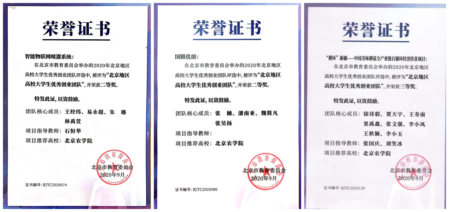 北京市教委组织举办的北京地区高校大学生优秀创业团队评选是北京地区具有广泛影响力、号召力和参与度的一项创新创业盛赛,自2014年以来已经举办六届。2020年北京地区高校大学生优秀创业团队6月份开始评选,共有62所高校及研究生培养单位推荐的1468支创业团队参与竞赛。按照北京市教委下发的京教函[2020]387号《关于公布2020年北京地区高校大学生优秀创业团队评选结果的通知》,共有150支创业团队获奖,我校3支创业团队在评选中脱颖而出,分获2项二等奖和1项三等奖的好成绩,学校荣获“优秀组织奖”。