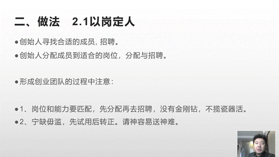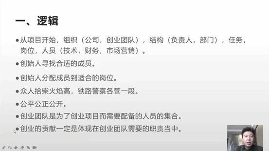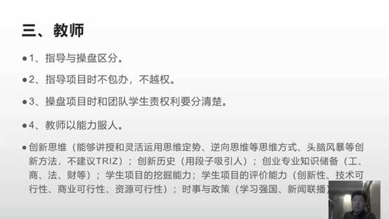 本次课程中,孙锡泉老师具体从“大学生创业指导的逻辑”“大学生创业指导的做法”“教师在创业团队中的作用”三个方面进行讲述,其中包括从创业项目开始进行组织、结构、任务、岗位、人员的设置;寻找适合成员、分配适合岗位、形成创业团队;创业团队中老师的角色等内容。