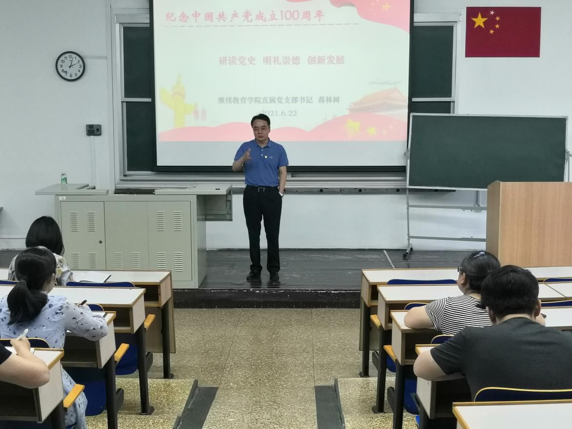 6月22日下午,继续教育学院直属党支部书记蒋林树为支部党员带来《研读党史 明礼崇德 创新发展》主题党课。