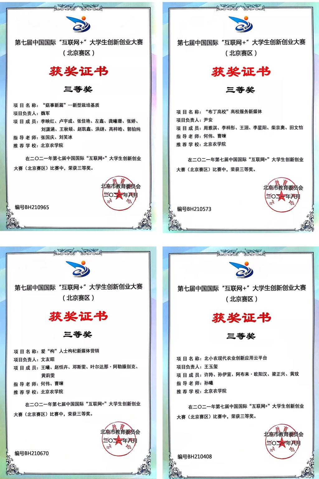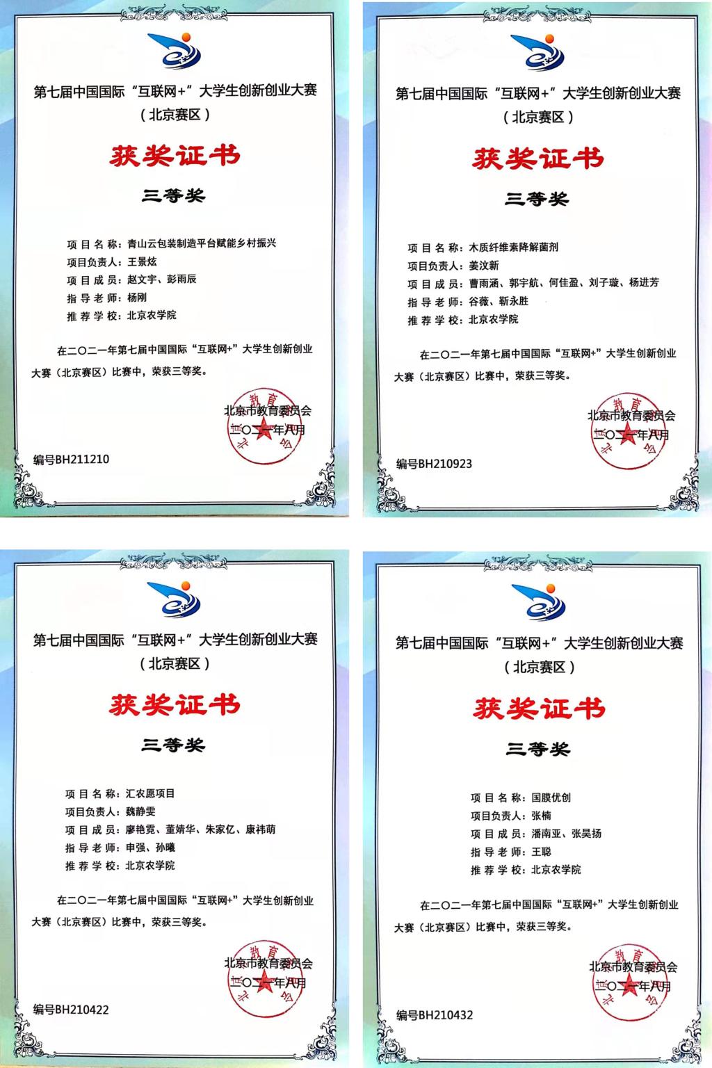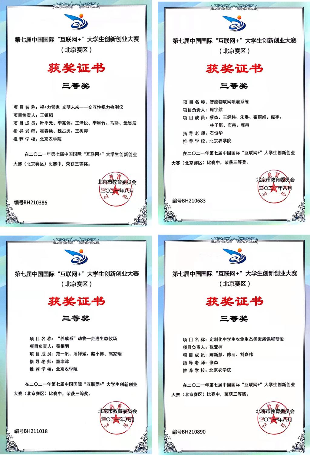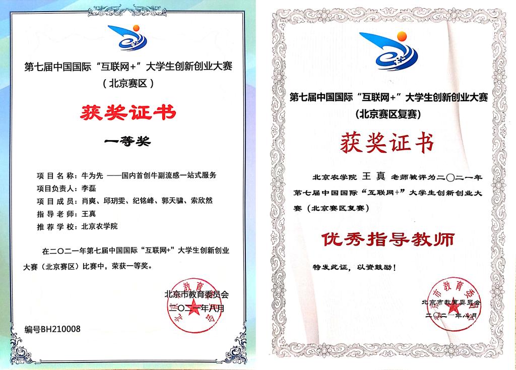 由我校动物医学、动物科学、市场营销、工商管理学生共同组队的“牛为先—国内首创牛副流感一站式服务”项目(指导教师:王真),与来自北京45所高校的406个项目,进入北京赛区“高教主赛道和“青年红色筑梦之旅赛道”的复赛,经过层层比拼,最终突出重围并荣获一等奖,同时进入国赛。指导教师王真老师荣获“优秀指导教师奖”。