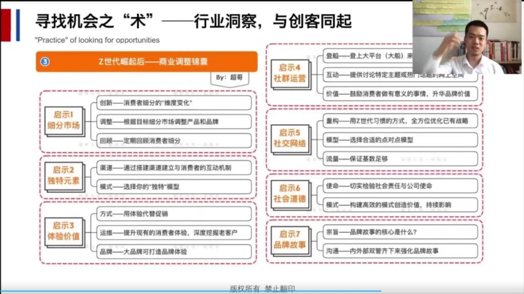 本次课程,郑超老师以多个创业案例为导入,从行业洞察分析了四种创客的类型,怎样获取创业机会以及分享了创业的锦囊妙计。直播课共有220人观看。