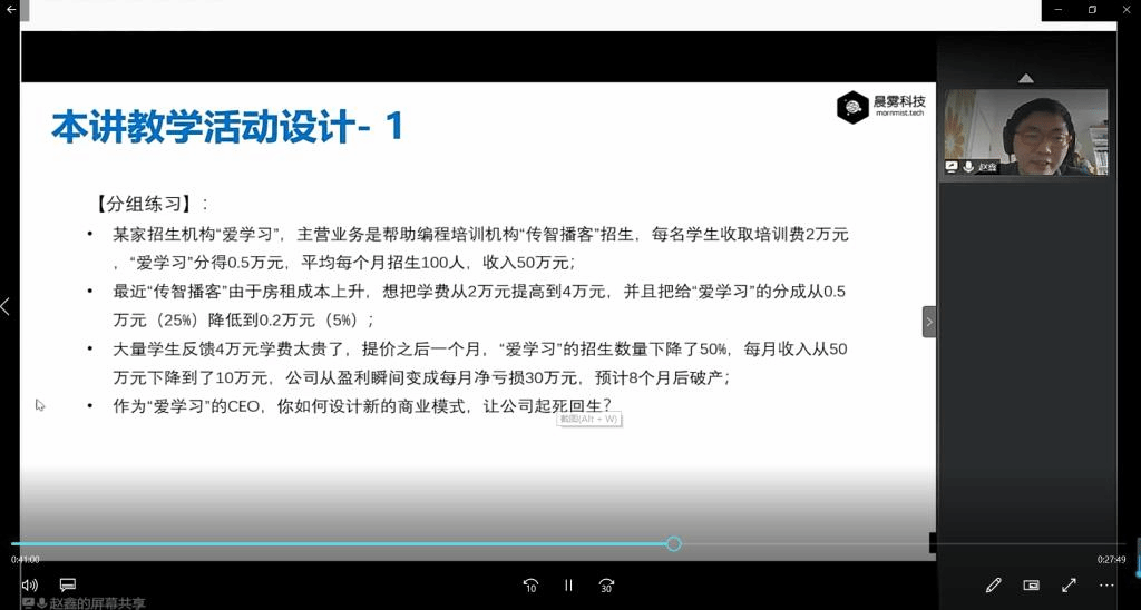 12月10日晚,“大学生创客行”创新创业系列教育课程第四讲精彩开讲。本次直播课邀请了天使投资人、晨雾科技创始人赵鑫老师,以“商业模式(上)”为主题进行了精彩分享。