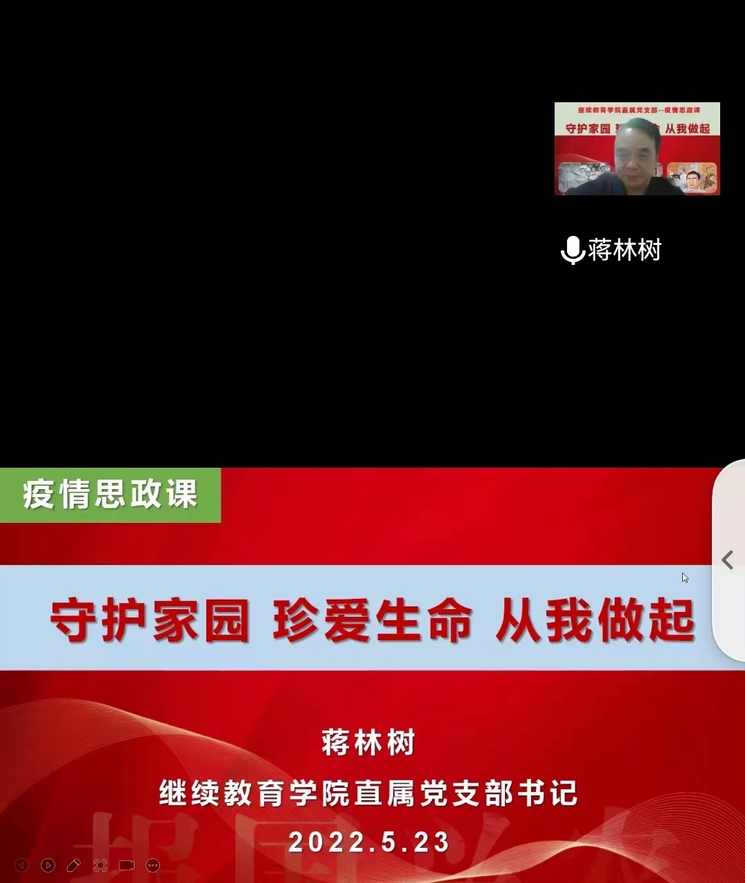 为深入学习贯彻习近平总书记关于疫情防控的一系列重要指示精神,落实党中央、国务院决策部署,北京市各项疫情防控措施及坚持“动态清零”总方针,坚决打好疫情防控阻击战,并进一步深刻理解当前校园疫情防控从严从紧的特殊性和重要性。在认真学习学校党委赵锋书记“团结一心众志成城-坚决打赢校园疫情防控阻击战”思政课的基础上,按照学校党委工作任务要求及相关部署安排,5月23日上午继续教育学院直属党支部书记蒋林树以《守护家园,真爱生命,从我做起》为题,通过网络会议为全院教师开讲疫情防控“大思政课”。