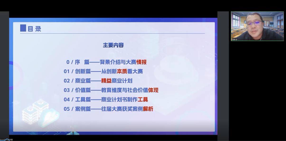3月9日晚,北京创孵投教育科技有限公司总经理郑科宇以“大赛商业计划书准备”为题,从创新本质、精益商业计划和BP协作撰写平台实操方面为同学们进行了讲解,并对往届大赛的获奖案例进行分享。