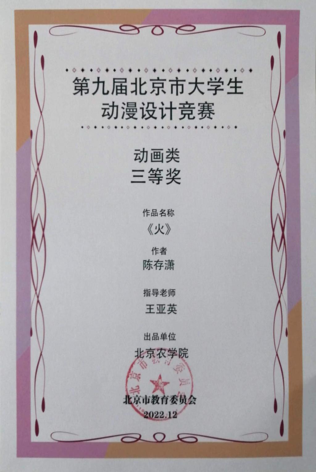 2022年(第九届)北京市大学生动漫设计竞赛是我校首次参赛,园林学院陈存潇创作的作品《火》经过层层评审后,最终从众多参赛作品中脱颖而出,喜获动画类三等奖。