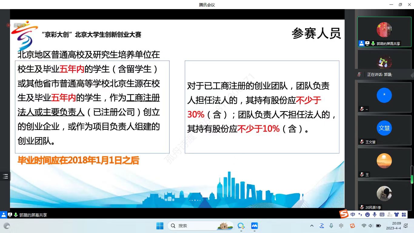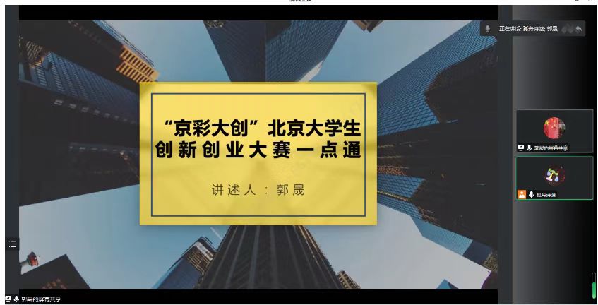 为推动学习贯彻习近平新时代中国特色社会主义思想主题教育落细落实,促进学校事业高质量发展,深入学习党的十九大及十九届历次全会精神,落实《国务院办公厅关于进一步支持大学生创新创业的指导意见》(国办发〔2021〕35号),推动“大众创业、万众创新”时代号角唱响京华大地,为青年学子创新创业、追求梦想、实现价值搭建精彩舞台。4月4日晚,创新创业学院特邀创业大赛资深评委郭晟老师进行“京彩生涯”创新创业训练营首场讲座,“京彩生涯”创新创业训练营将重点遴选、培育第二届“京彩大创”北京大学生创新创业大赛项目。