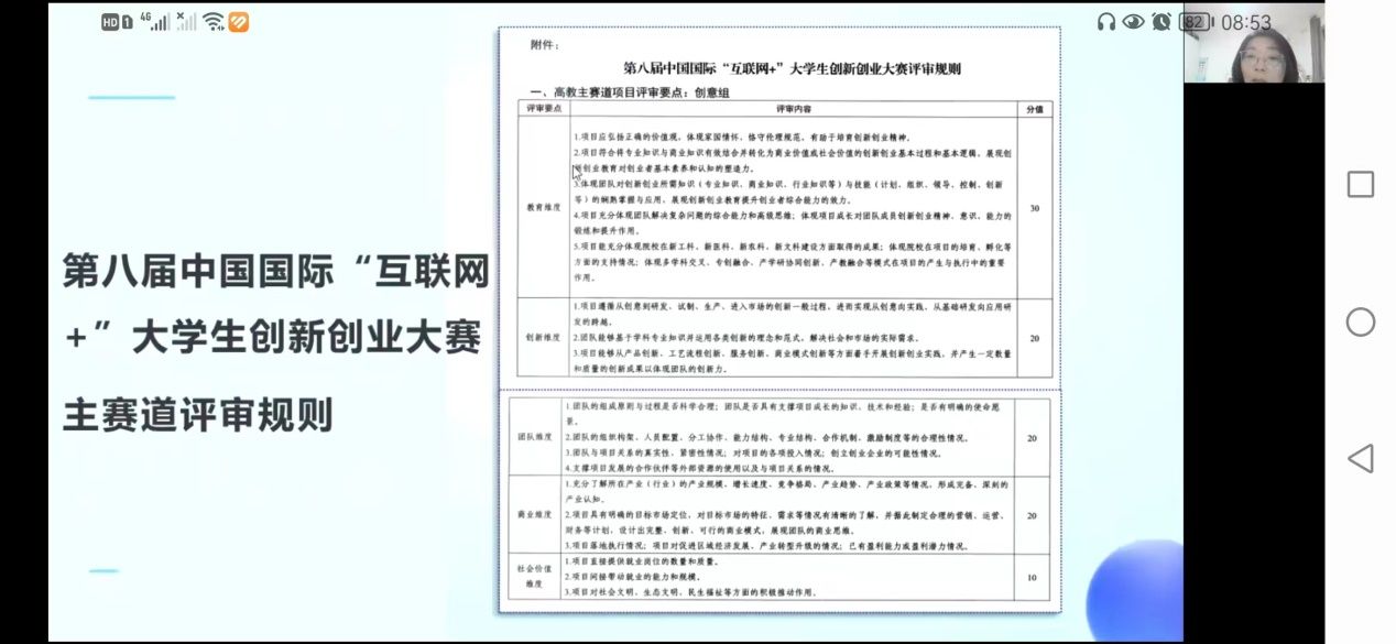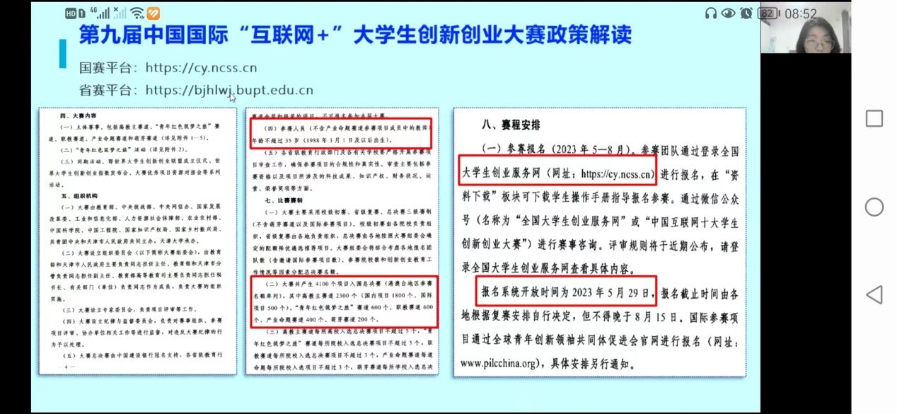 为引导和激励我校学生积极投入创新创业活动,营造浓厚的创新创业氛围,培养我校青年学生的创新和实践能力,推动创新创业教育工作的深入开展,对第九届中国国际“互联网+”大学生创新创业大赛的相关安排和比赛流程有更加清晰的了解。6月4日晚七点,通过线上腾讯会议,创新创业学院副院长孙曦为同学们进行第九届“互联网+”备赛前的宣讲,孙老师以大赛的双创教育改革的四个纲领性文件的引领开场,通过往届大赛回顾来看历届的发展,从参赛对象、各赛道的异同、赛道组别的具体要求及区分到各赛道评审规则,层层细致深入进行了讲解。