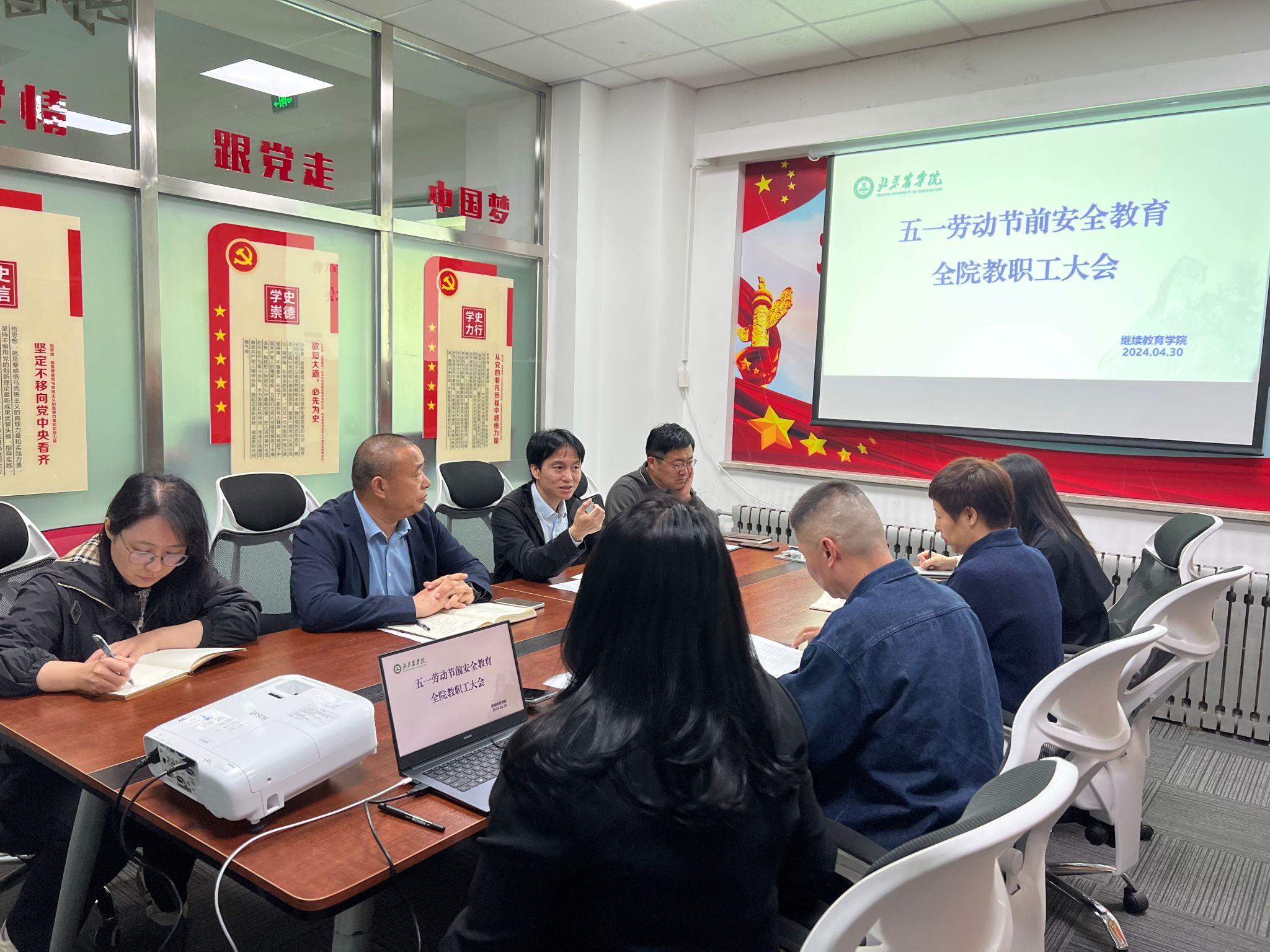 4月30日上午,继续教育学院、太阳集团tyc5997召开全院教职工大会,部署“五一”节日期间安全稳定工作。