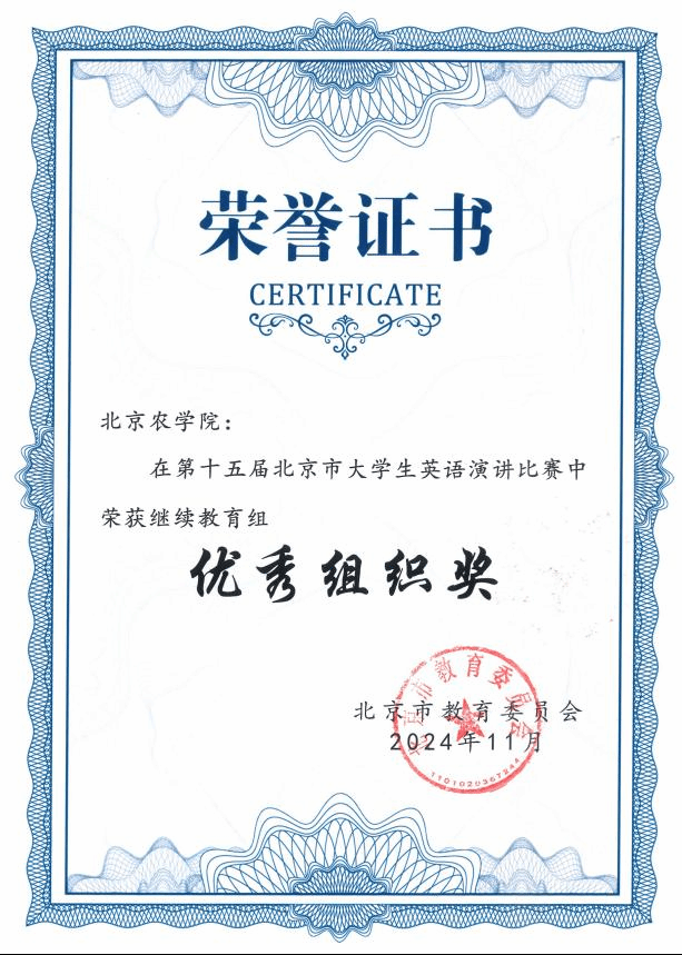 在第十五届北京市大学生英语演讲比赛中,我校荣获继续教育组优秀组织奖。本次比赛由北京市教育委员会主办,北京外国语大学、北京师范大学、对外经济贸易大学等15所高校参加了继续教育本科组的复赛和决赛。
